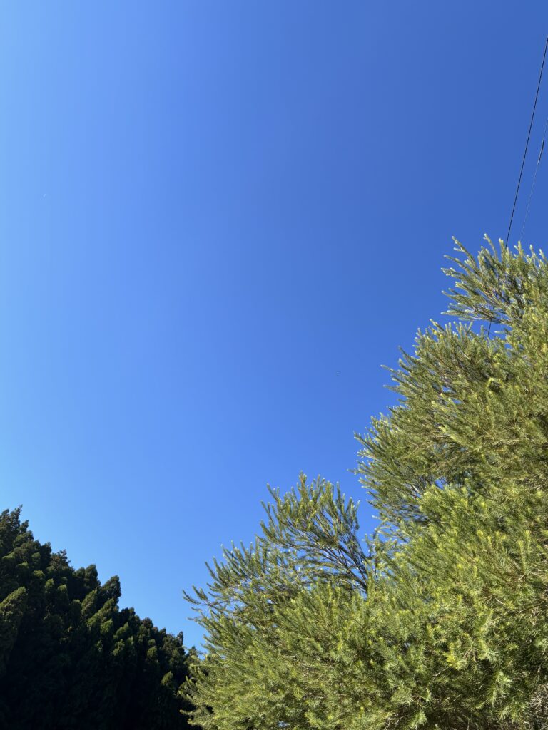 今朝の空は澄み切った青空です。太陽が七色に光っておつくしいです。