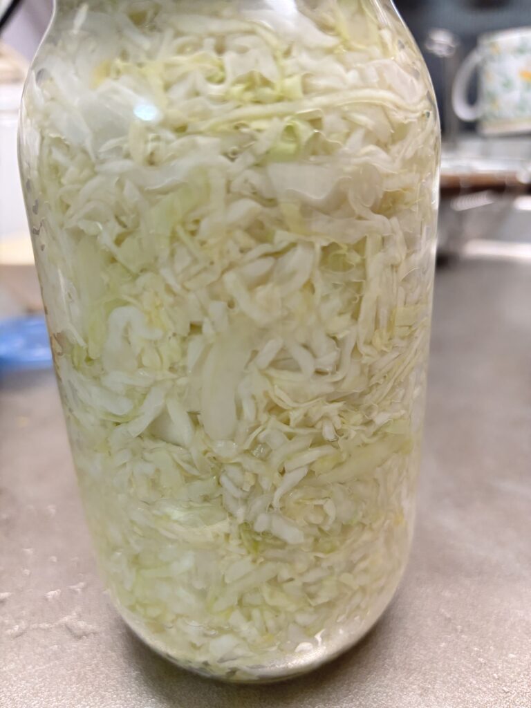 ちょこっと情報→ザワークラウトとはキャベツと塩を乳酸発酵させて作る。ドイツの伝統的な漬物で「酸っぱい、キャベツ」を意味し、強い酸味と独特の風味が特徴のようです。酢を使わずにキャベツ自身の乳酸菌の働きで発酵させ、腸活に良い植物性乳酸菌が豊富で、肉料理の付け合わせや煮込み料理などに合うようです。