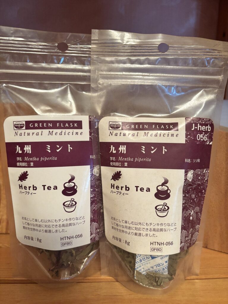 ちょこっと情報→九州ミントの効能は、花粉症やアレルギー性鼻炎、風邪の鼻づまり、食べ過ぎや過敏性腸症候群などの消化器系の不良、頭痛のほか、メントールはリフレッシュの後に鎮静作用があるため入眠安眠効果があります。緑茶や紅茶とのブレンドともオススメのメディカルハーブです!