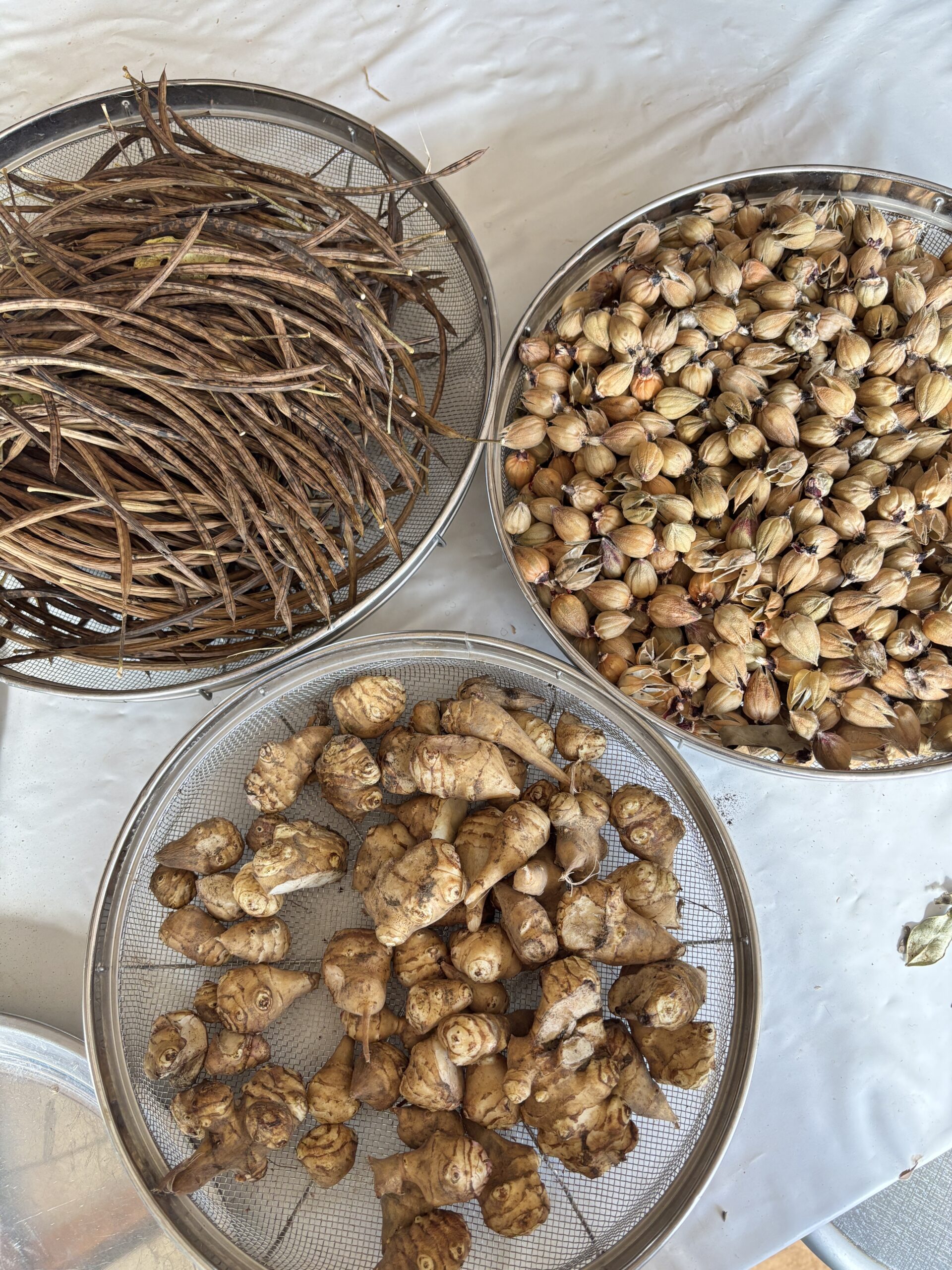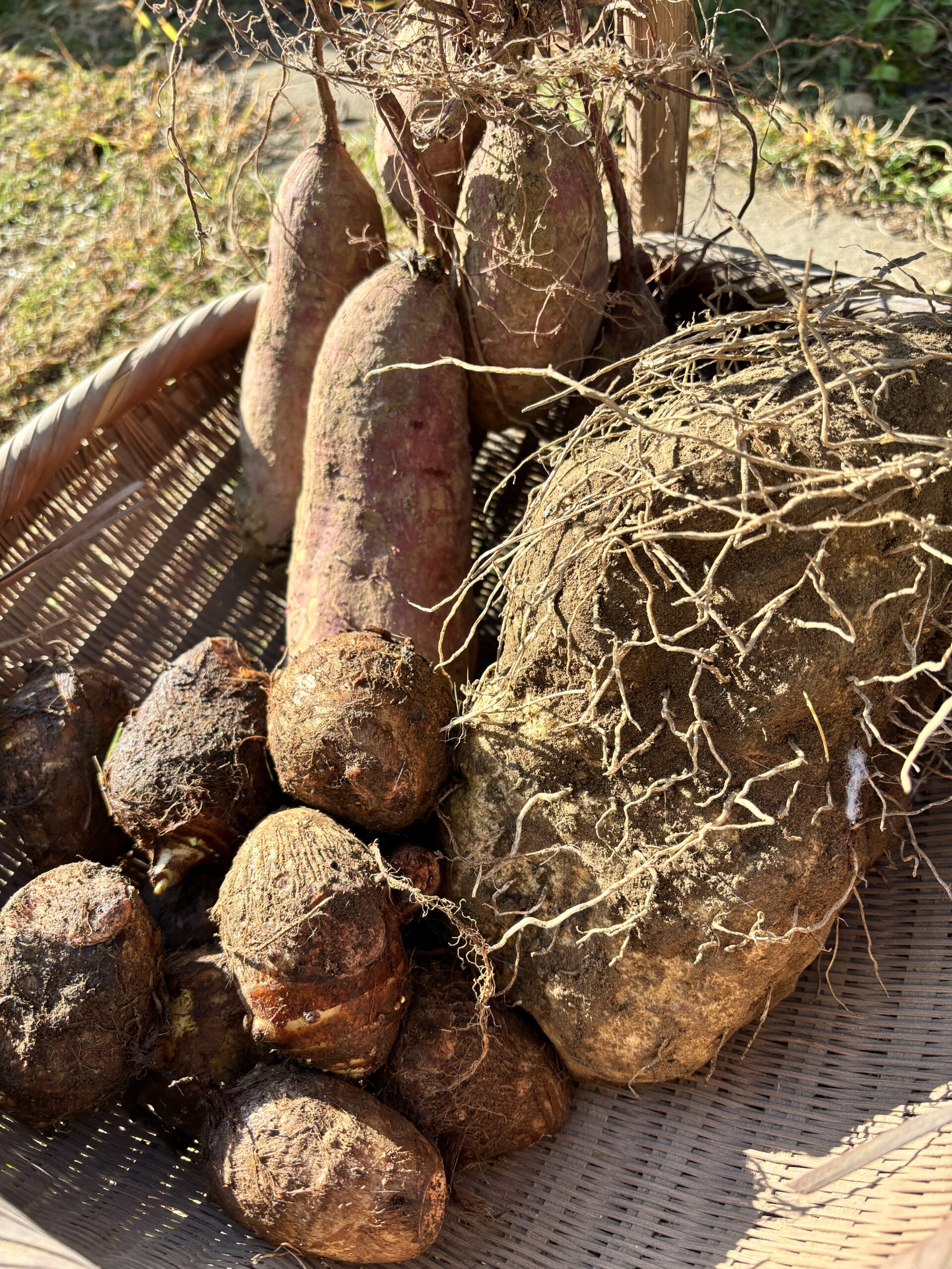 里芋、山芋、さつま芋、小豆を村人にいただきました(多謝)。ちなみに、小豆は3升も収穫できたそうで〜すごい!グリンティの畑で収穫した決明子、菊芋、ローゼルは種子用に保存します。