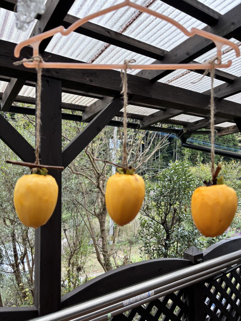 ちょこっと情報→干し柿にはβ-カロテンやカリウム、健康や美容に良い栄養素を豊富に含み、また食物繊維を多く含んでいるので、腸内細菌の活性化、バランスも整え、スムーズな便通に役立つそうです。他にのたくさん良い点があるようです。糖分を多く含むので、食べ過ぎには注意です。何事も過ぎたるは及ばざるが如し〜ですね!