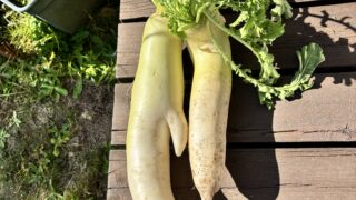ほったらかし農法、ビニールハウスの青いパプリカとおかわかめ!頂き物の特大大根〜