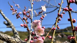 本日は月の一度の村の集まり「一日籠り」あ朝7時30分にお宮に集合。ハーブ畑に梅の花!