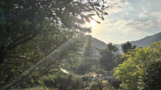 太陽の光がハーブ畑を照らしてキラキラ美しい朝!サフランの花、らっきょの花、石垣に咲く小菊、玉ねぎの畝〜