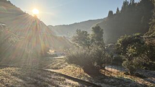 霜が降りてキラキラ美しい朝!丸太に紫の光、畑には白い丸い球体が浮いている〜まるで天然の美術館❣️