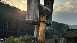 煙突と光〜!薪の種類ごく一部をご紹介〜樫の木、杉、肉桂、ティートリーなどを燃やしてお風呂を沸かします。