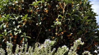 今朝のハーブ畑からの空模様〜たくさんの鱗雲!金木犀、銀木犀、今年は3週間ほど遅い収穫です。